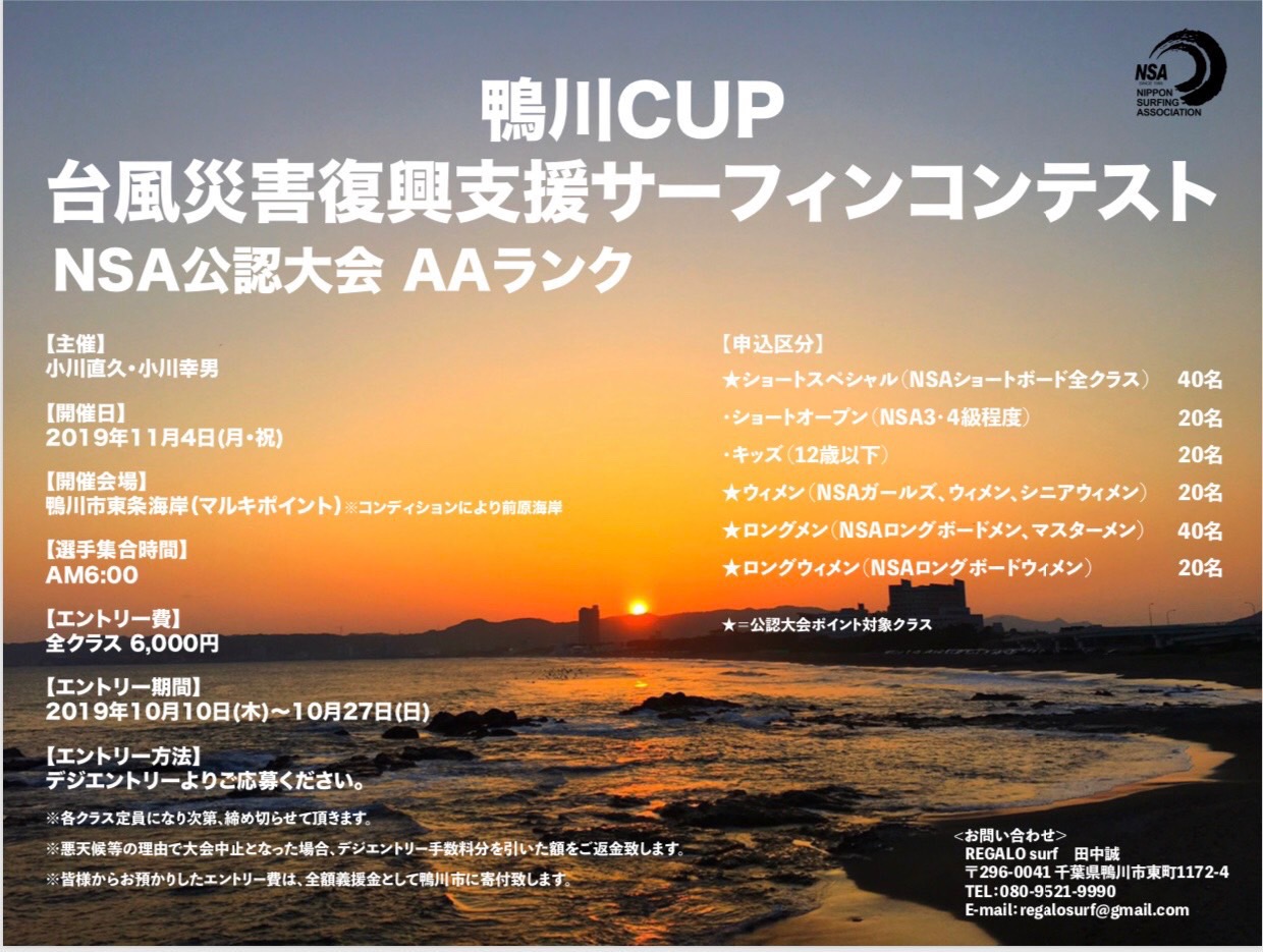 1ヶ月経った今もなお復興できず、大変な思いをされている方々が大勢いる中、鴨川出身の日本を代表するプロサーファー兄弟、小川直久と小川幸男が中心となり、来たる11/4(月)に被災地復興支援を目的としたNSA公認大会AAランク・チャリティー・サーフィンコンテスト”鴨川CUP”が開催されることが決定!